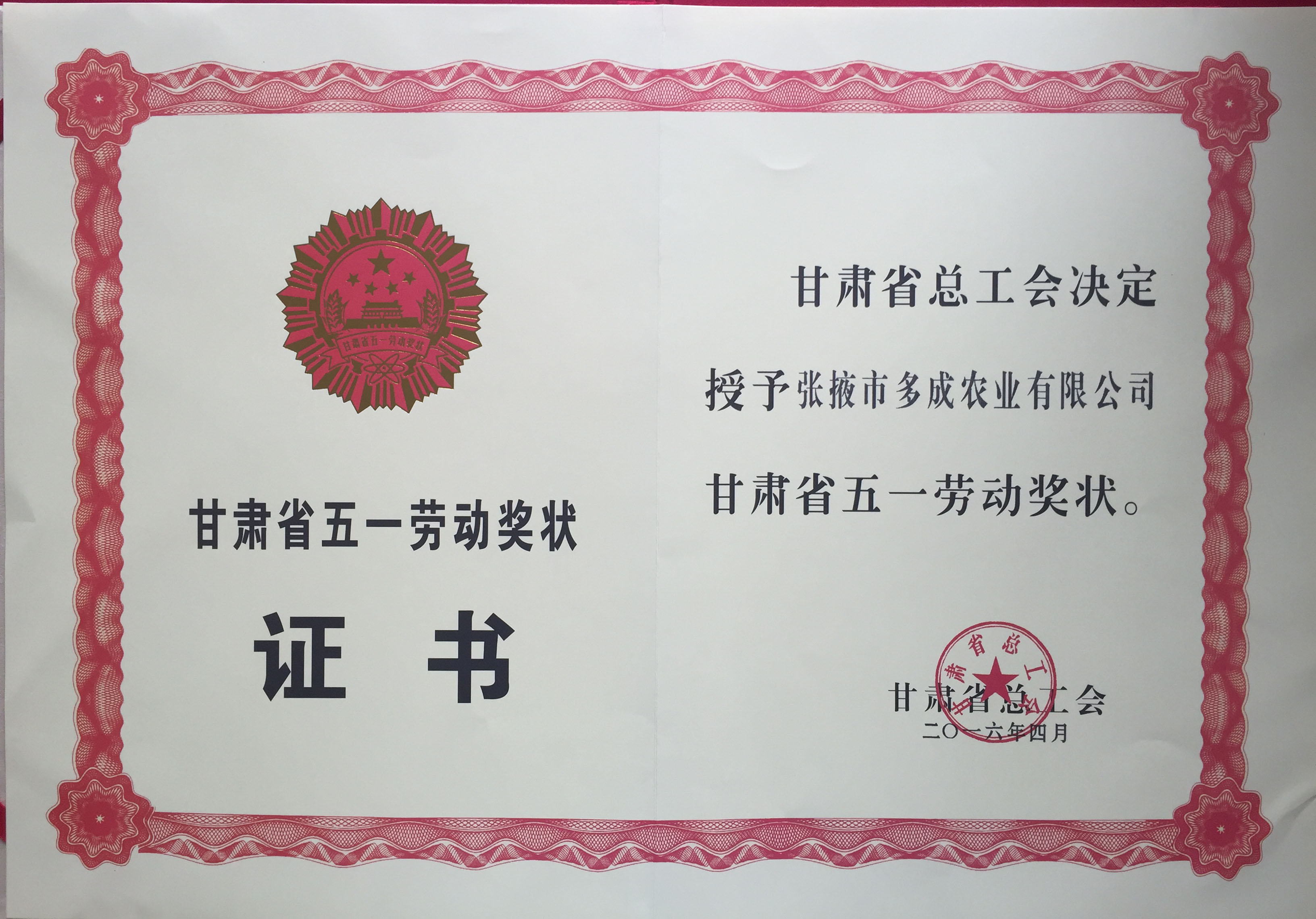 | 熱烈祝賀張掖市多成農(nóng)業(yè)有限公司榮獲甘肅省五一勞動(dòng)獎(jiǎng)狀 | ||