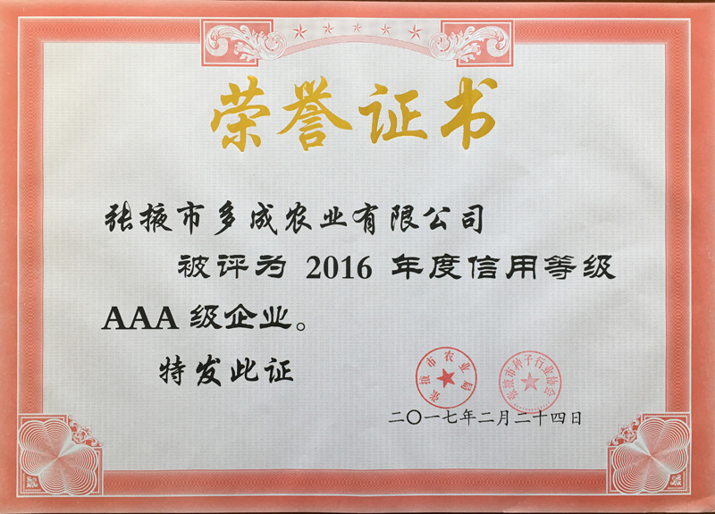 | 熱烈祝賀張掖市多成農(nóng)業(yè)有限公司被評為2017年度信用等級(jí)AAA級(jí)企業(yè)!! | ||