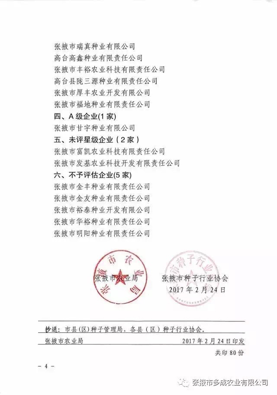 | 熱烈祝賀張掖市多成農(nóng)業(yè)有限公司被評為2017年度信用等級(jí)AAA級(jí)企業(yè)。 | ||