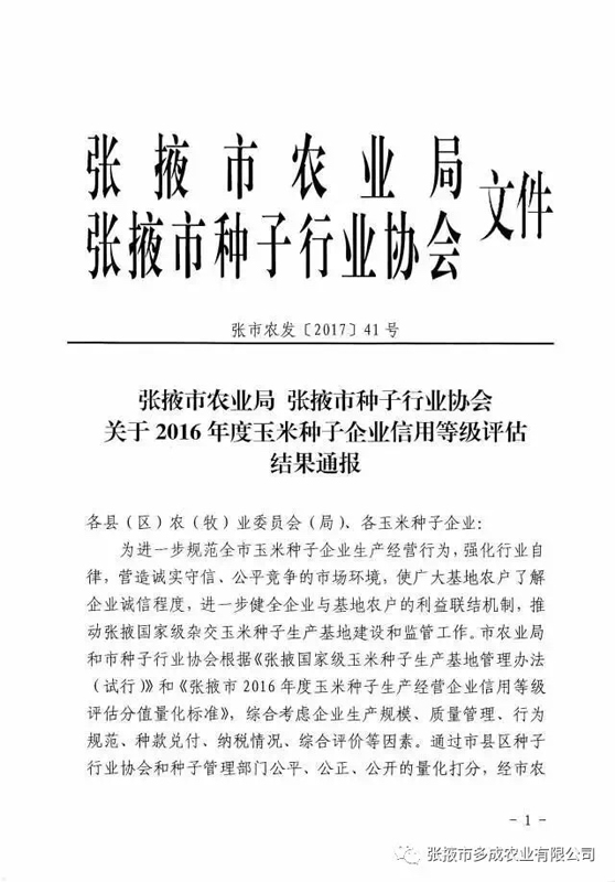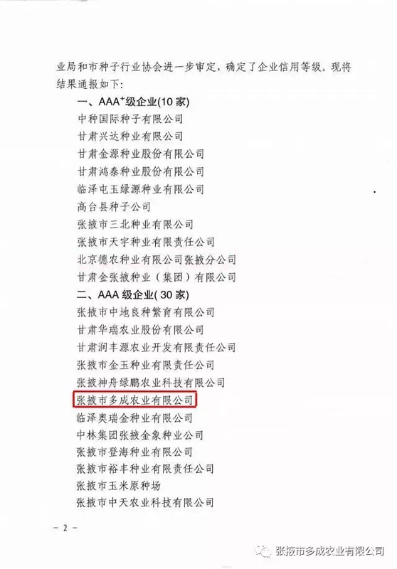 熱烈祝賀張掖市多成農(nóng)業(yè)有限公司被評為2017年度信用等級(jí)AAA級(jí)企業(yè)! 2017年2月24日,張掖市農(nóng)業(yè)局、張掖市種子行業(yè)協(xié)會(huì)公布的《2016年度玉米種子企業(yè)信用等級(jí)評估結(jié)果》中,張掖市多成農(nóng)業(yè)有限公司被評為2016年度信用等級(jí)AAA級(jí)企業(yè)。 |